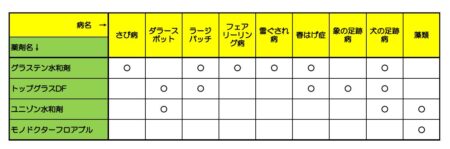 下記表は芝生の病気に総合的に効果のある3種類の薬と、芝生に生える藻に特に効果のある1種類の薬がどんな病気に対応しているのかを示しています。