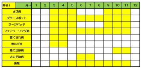 では続いて 芝生に生じる主だった 病気と発生時期について紹介します。
