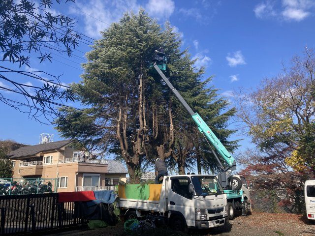クレーン車や高所作業車を使うことで、高木や電線近くの伐採や剪定を安全に、かつ効率的に行えます。
