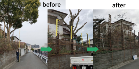 家屋の屋根やフェンスなどを壊さないように慎重に枝を下ろしました。